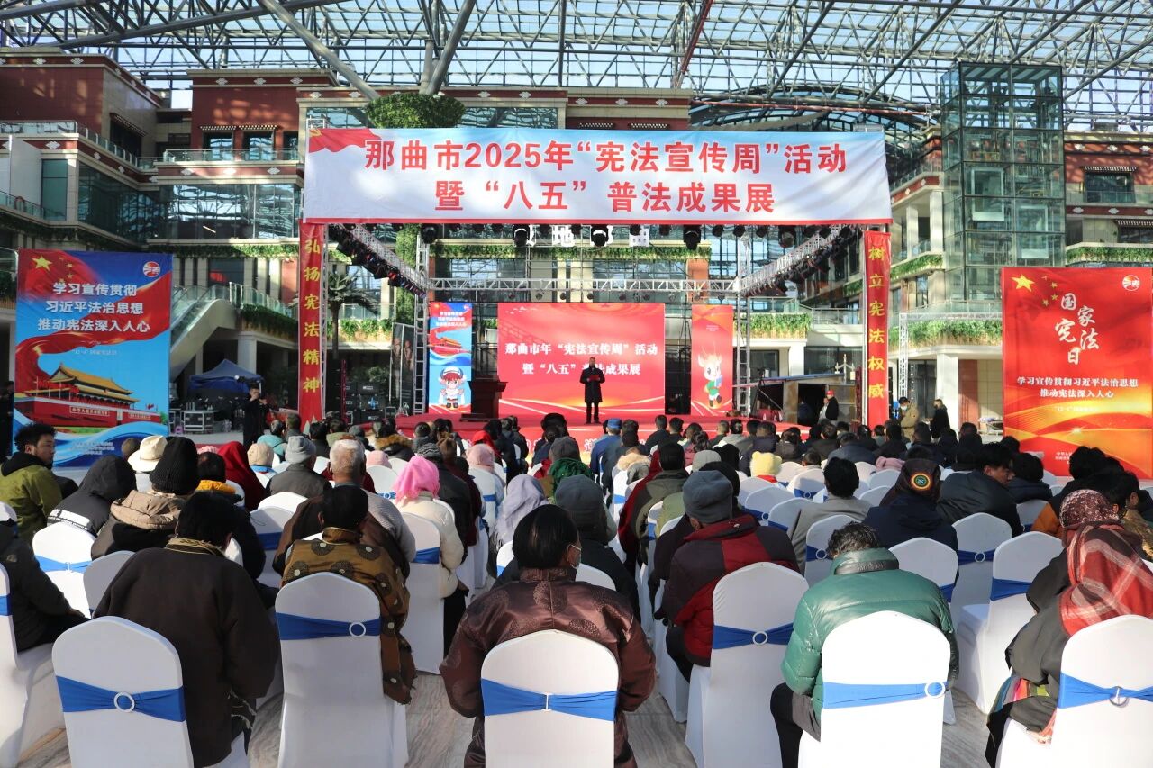 为深入学习宣传贯彻习近平法治思想,切实增强全民宪法意识与法治信仰,全面展现那曲市法治建设丰硕成果,巩固拓展法治宣传教育成效,凝聚全社会尊法学法守法用法的思想共识与行动自觉,12月4日,那曲市2025年“宪法宣传周”启动仪式暨“八五”普法成果展在神力时代广场举行。市委、市人大、政府、政协相关领导同志出席活动;市(中)直相关单位代表、各县(区)负责同志,以及寺庙僧尼、师生代表、群众代表共同参与。