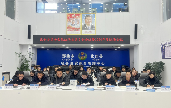 近日,受县委书记、县委全面依法治县委员会主任李成统委托,县委副书记、县委全面依法治县委员会副主任杨洪主持召开比如县全面依法治县委员会会议暨2024年度述法会议。强调,要深入学习贯彻习近平法治思想,坚持问题导向、强化系统思维,着力增强做好全面依法治县工作的责任感、紧迫感,一体推进法治比如、法治政府、法治社会建设,以高水平法治建设护航比如经济社会高质量发展。